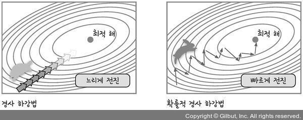 경사 하강법의 불필요하게 많은 계산량은 속도를 느리게 할 뿐 아니라, 최적 해를 찾기 전에 최적화 과정이 멈출 수도 있다. 확률적 경사 하강법(Stochastic Gradient Descent, SGD)는 경사 하강법의 이러한 단점을 보완한 방법이다. 전체 데이터를 사용하는 것이 아니라, 랜덤하게 추출한 일부 데이터를 사용한다. 일부 데이터를 사용하므로 더 빨리 그리고 자주 업데이트를 하는 것이 가능해졌다.