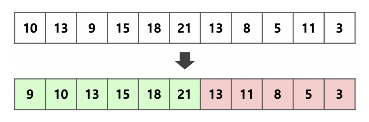 - 병합 정렬은 균등하게 분할하였다면 퀵 정렬은 Pivot을 설정하고 그 기준으로 정렬한다.