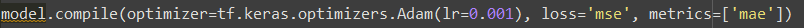 여기서 loss는 손실함수를 의미한다. 모델을 훈련시킬때 이 손실 함수를 최소로 만들어주는 가중치들을 찾는 것을 목표로 한다. 위 예에서는 손실함수로 MSE(mean squared error)를 사용하였다. 손실함수로 MSE만 사용할 수 있는 것이 아니고, 위에서 설명했던 MAE(mean absolute error), hinge, categorical crossentropy, sparse categorical crossentropy, binary crossentropy 등도 사용할 수 있다. 여러 손실 함수 중에서 자신이 훈련시키는 모델에 적합한 손실함수를 선택해주면 된다. 예를 들어, 10개의 클래스를 분류할 수 있는 분류기를 훈련시키는 경우에는 손실함수로 sparse categorical crossentropy를 사용할 수 있다.