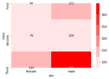 sns.heatmap(titanic_size, annot=True, fmt='d', cmap=sns.light_palette('red'))