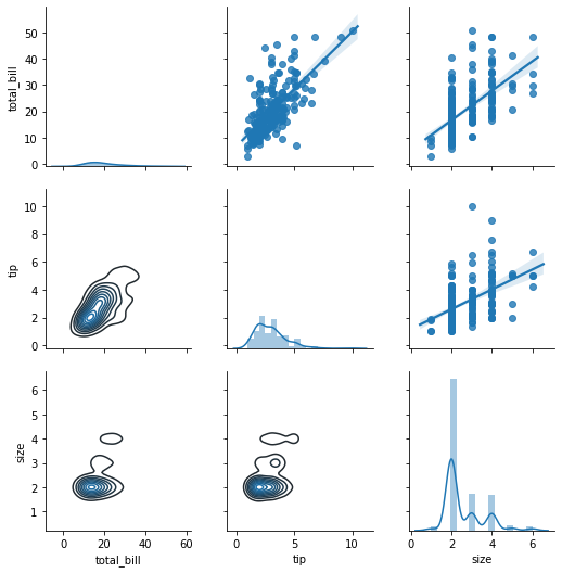 위의 pairplot과 같이 위쪽은 regplot을, 아래쪽은 kdeplot, 그리고 가운데는 distplot을 넣어주었습니다.