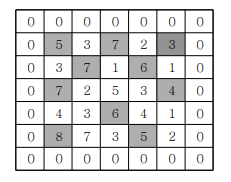 지도 정보가 N*N 격자판에 주어집니다. 각 격자에는 그 지역의 높이가 쓰여있습니다. 각 격자 판의 숫자 중 자신의 상하좌우 숫자보다 큰 숫자는 봉우리 지역입니다. 봉우리 지역이 몇 개 있는 지 알아내는 프로그램을 작성하세요. 격자의 가장자리는 0으로 초기화 되었다고 가정한다. 만약 N=5 이고, 격자판의 숫자가 다음과 같다면 봉우리의 개수는 10개입니다.