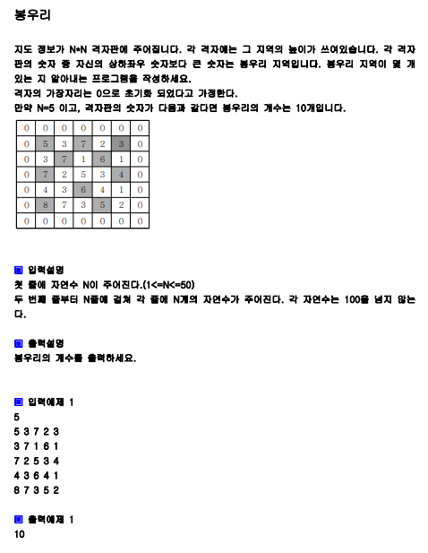 지도 정보가 N*N 격자판에 주어집니다. 각 격자에는 그 지역의 높이가 쓰여있습니다. 각 격자 판의 숫자 중 자신의 상하좌우 숫자보다 큰 숫자는 봉우리 지역입니다. 봉우리 지역이 몇 개 있는 지 알아내는 프로그램을 작성하세요. 격자의 가장자리는 0으로 초기화 되었다고 가정한다. 만약 N=5 이고, 격자판의 숫자가 다음과 같다면 봉우리의 개수는 10개입니다.