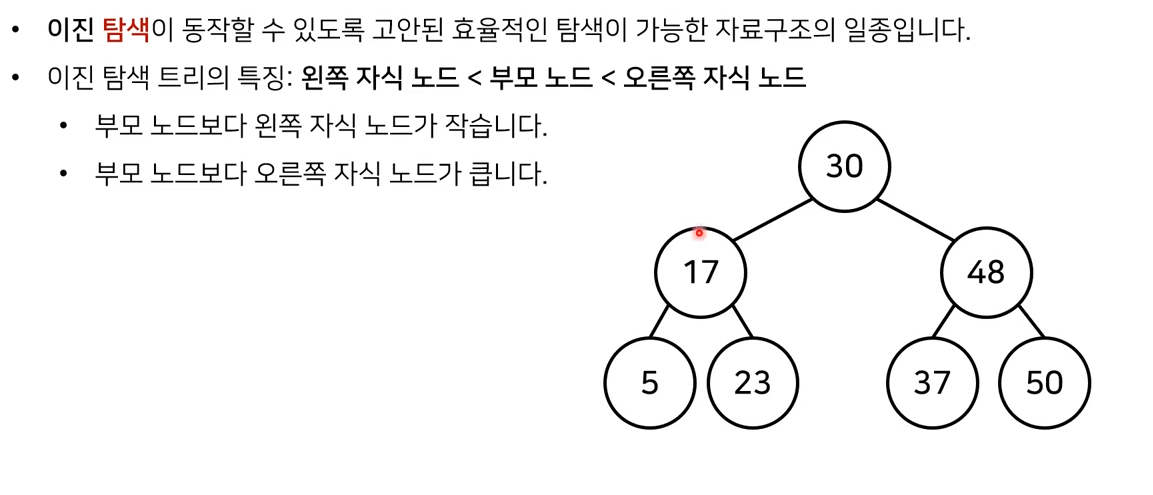 이진 트리는 다음(next) 노드가 아닌 왼쪽과 오른쪽 2개의 자식(child) 노드를 가리킨다는 점만 빼고 연결리스트의 구성과 비슷하다.