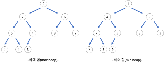 - 부모 노드의 키값이 자식 노드의 키값보다 항상 크거나 같은 크기의 관계