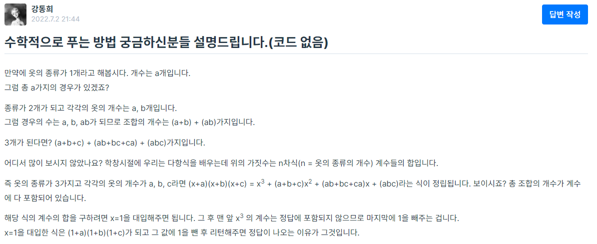 스파이가 가진 의상들이 담긴 2차원 배열 clothes가 주어질 때 서로 다른 옷의 조합의 수를 return 하도록 solution 함수를 작성해주세요.