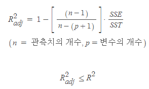 - 수정 R^2는 앞에 특정 계수를 곱해 줌으로써 (보정) 유의하지 않은 변수가 추가될 경우 증가하지 않게 함