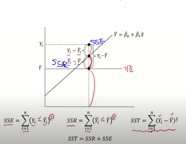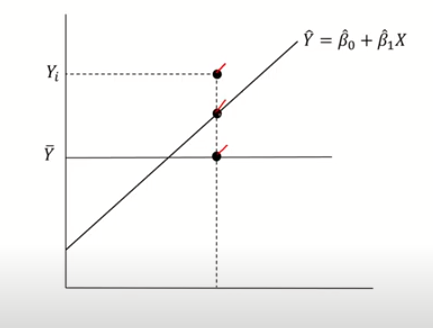 위에서부터 첫번째 점은 실제 Y값 두번째 점은 우리가 구한 회귀 직선 위에 있는 Y값 세번째 점은 Y의 평균값