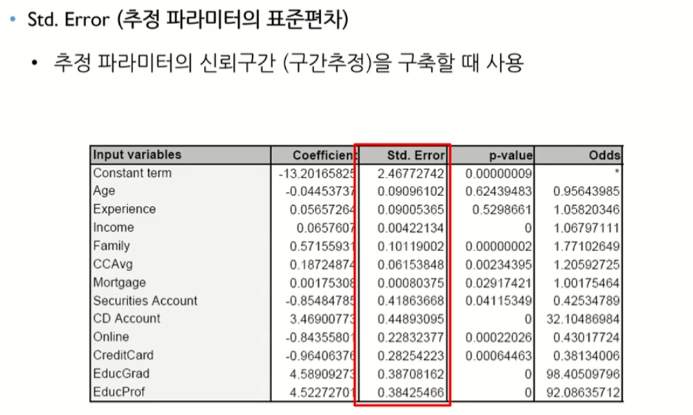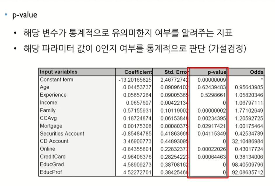 해당 변수가 Y값에 관계가 있는지를 보여줌, 그리고 가설 검정에 쓰인다.