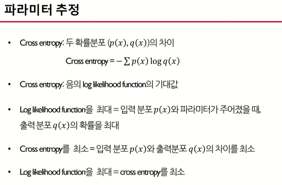 로그 최대 우도 함수 값을 최대화 -> Cross Entropy 값을 최소화하는 값을 찾아야함!