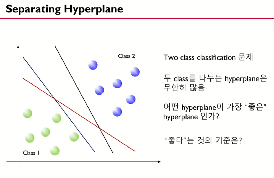 무한히 많은 것들 중 가장 좋은 하이퍼플레인을 찾아야함