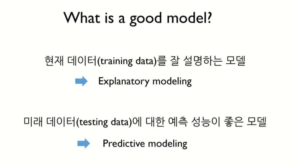 - 미래 데이터(testing data)에 대한 예측 성능이 좋은 모델