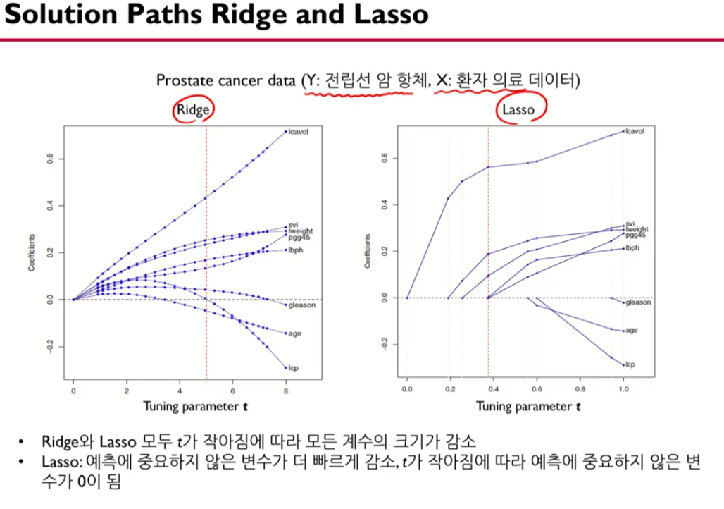 라쏘는 튜닝 파라미터가 작아질수록 제약을 많이 되고 0이 되는 변수가 생김