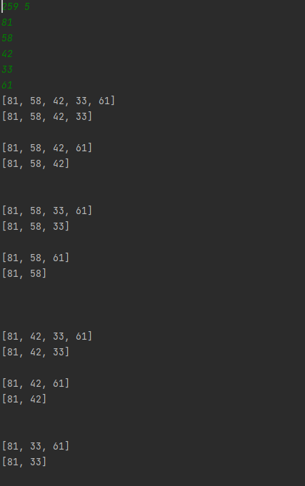 여기까지 구현하여 출력하면 다음과같이 부분집합이 구해짐을 알 수 있다.