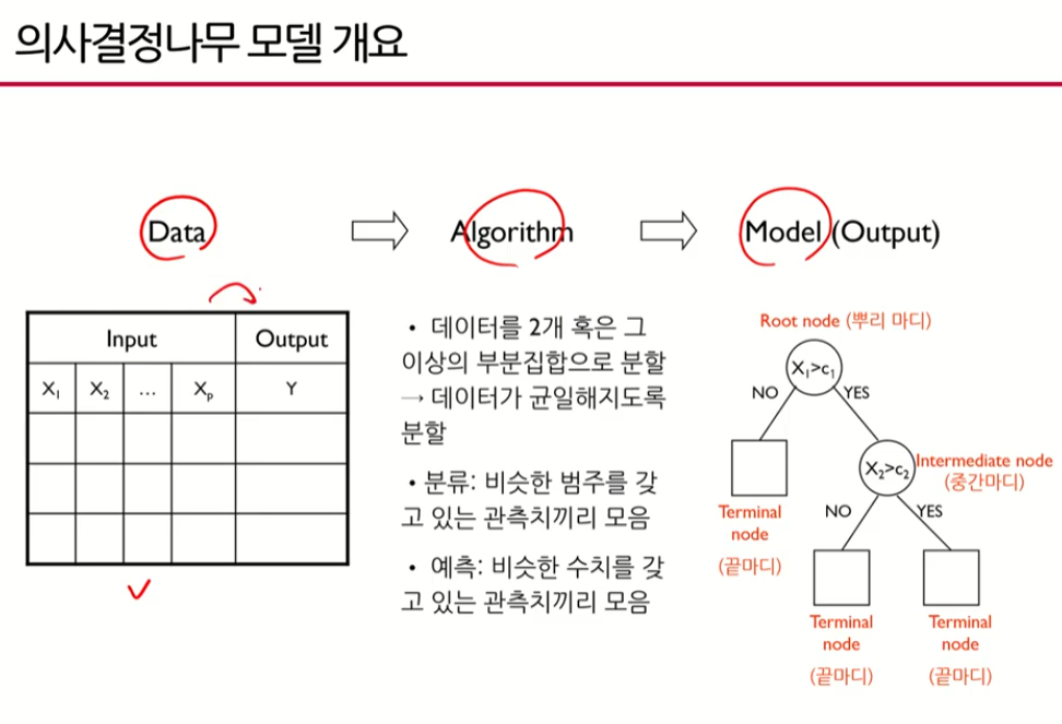 - 데이터에 내재되어 있는 패턴을 변수의 조합으로 나타내는 예측/ 분류 모델을 나무의 형태로 만드는 것