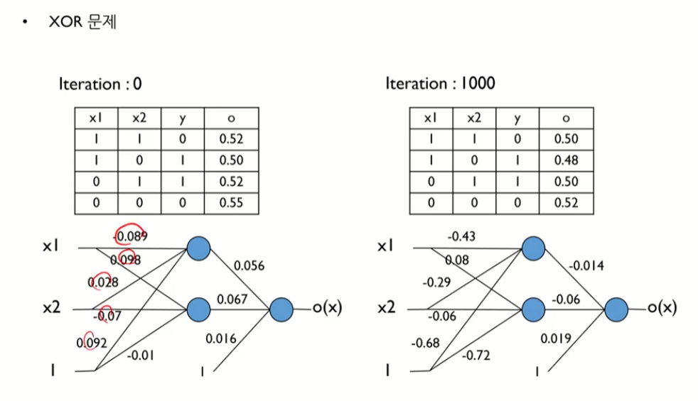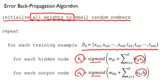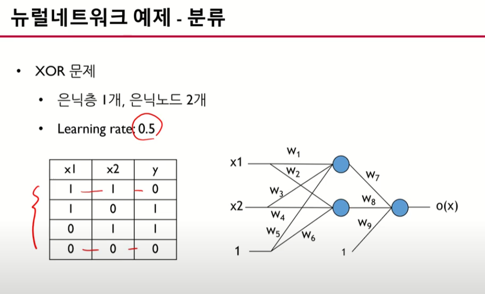 첫번째 트레이닝 값이 들어왔을 때 히든 노드 값 h와 출력 값o를 할당