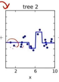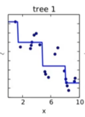 | 트리모델을 이용해서 데이터를 pick 한 것 | 첫번째 트리모델에서 y값과의 차이 첫번째 트리로 부터 나온 값에서 residual을 구한 값 |