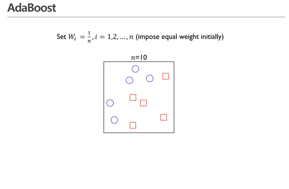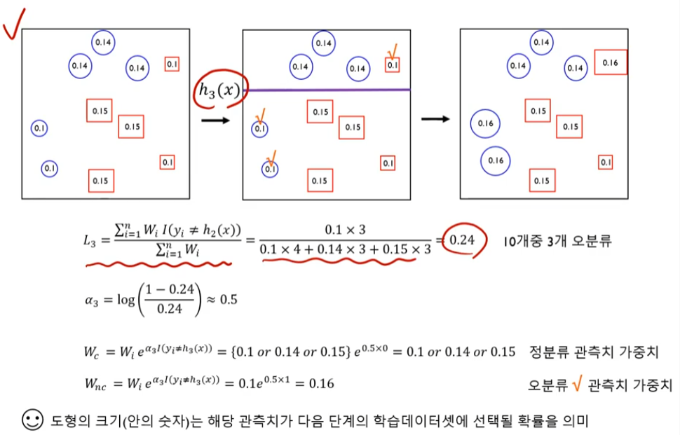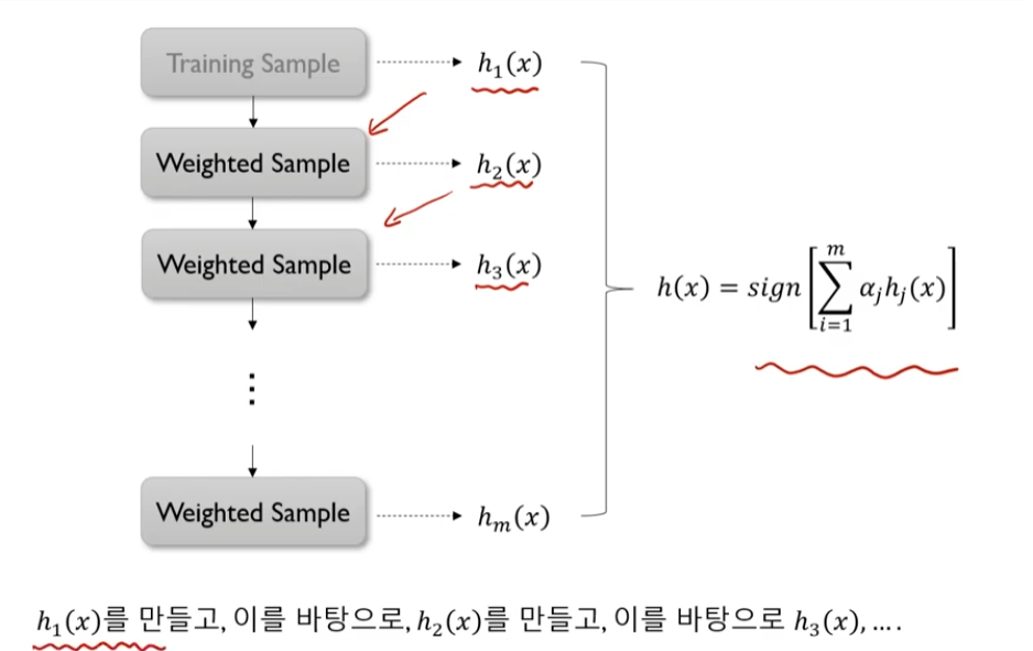 - 앞 단계에서 조정된 확률(가중치)을 기반으로 다음 단계에서 사용될 training dataset를 구성