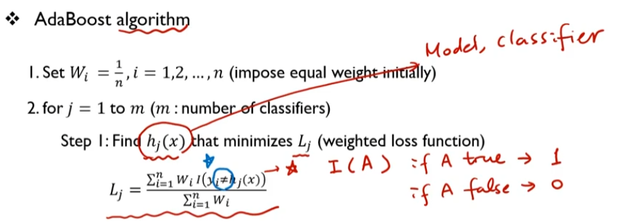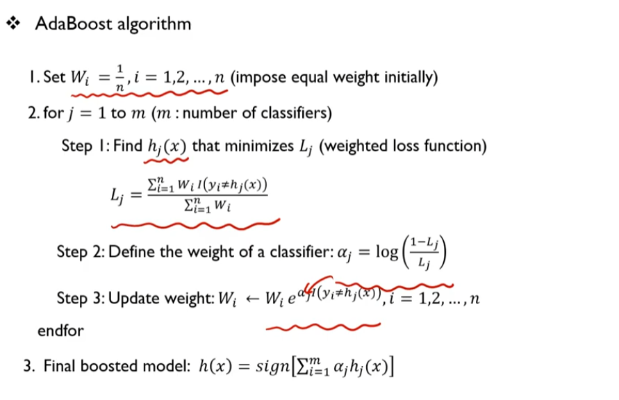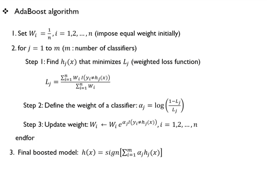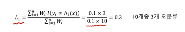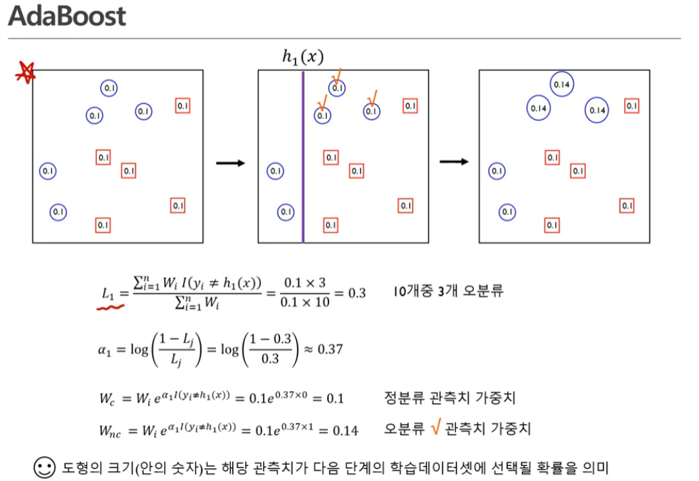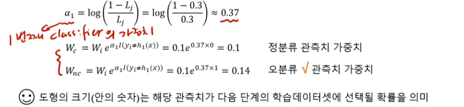 - Training error 가 큰 관측치의 선택 확률(가중치)를 높이고, training error가 작은 관측치의 선택 확률을 낮춤