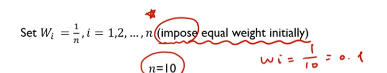 - 첫번째 스탭: 가중치를 줄 때 1/n으로 주겠다.