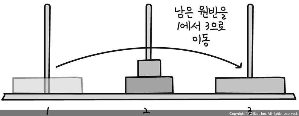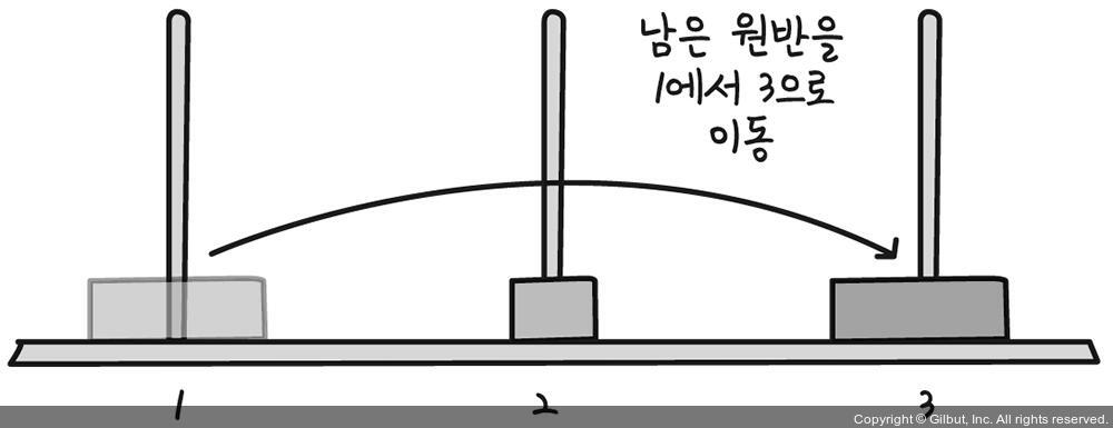 ➋ 1번 기둥에 남아 있는 큰 원반을 3번 기둥으로 옮깁니다(1 → 3).