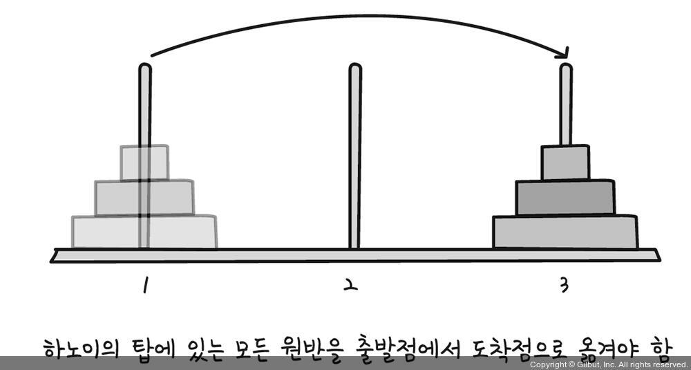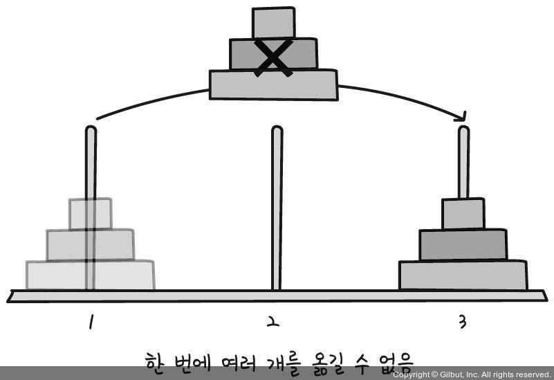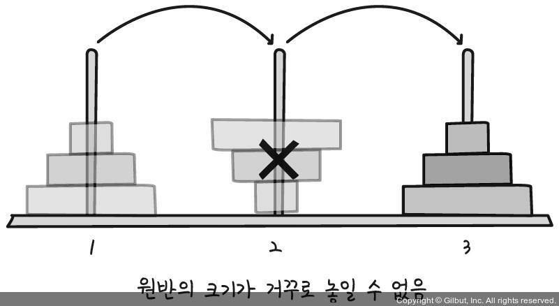 원반을 맨 위에서 하나씩만 꺼내서 옮겨야 한다는 제약이 없다면 원반을 한꺼번에 다 뽑아서 3번 기둥으로 옮기면 됩니다. 그리고 작은 원반 위에 큰 원반을 올릴 수 있다면 1번 기둥에 있는 원반을 하나씩 빼서 2번 기둥으로 다 옮긴 다음 다시 3번으로 옮기면 끝나는 간단한 문제입니다. 하지만 제약 사항을 지켜야 하므로 그렇게 간단히 끝나지는 않습니다.
