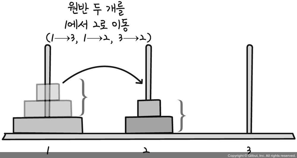 원반이 세 개일 때부터는 조금 더 생각을 해야 합니다. 원반이 세 개인 문제를 풀기 전에 원반이 두 개인 문제를 이미 풀었다는 사실을 꼭 기억해야 합니다. 즉, 우리는 특정 기둥에 있는 원반 두 개를 우리가 원하는 기둥으로 옮기는 방법을 이미 알고 있다는 것입니다.