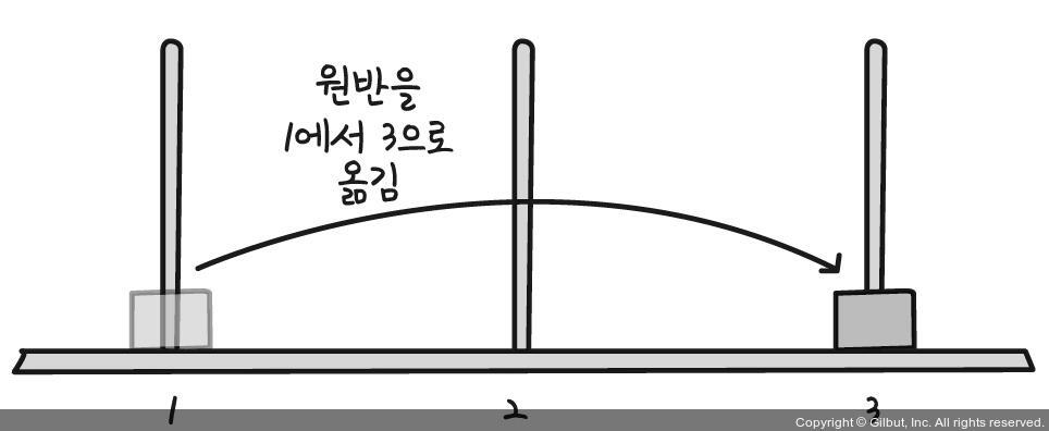 1번 기둥에 있는 원반을 3번 기둥으로 옮기면 끝납니다(1 → 3).