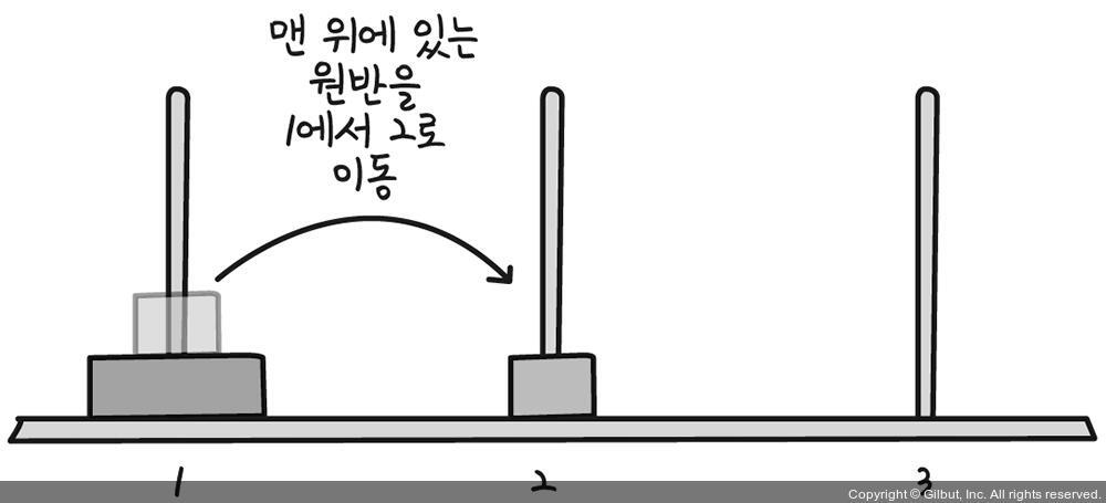 ➊ 1번 기둥의 맨 위에 있는 원반을 2번 기둥으로 옮깁니다(1 → 2).