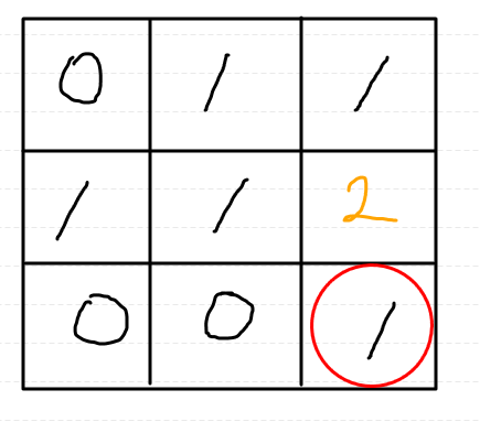 2라고 메모를 해주었지만 신경쓸 필요 없다. 본질은 해당 칸이 정사각형을 만들 수 있는 지 없는지에 달려있기 때문이다.