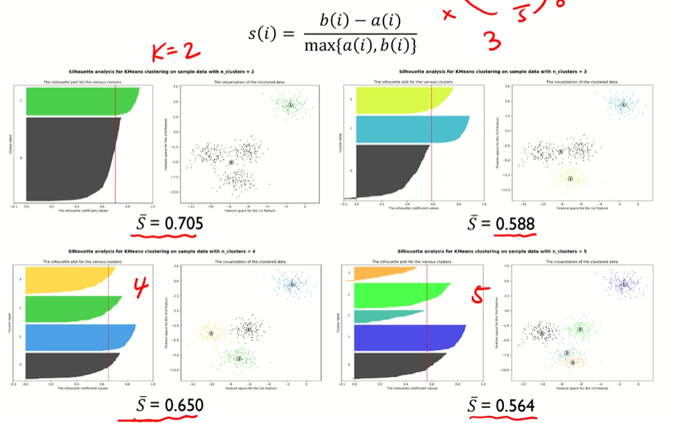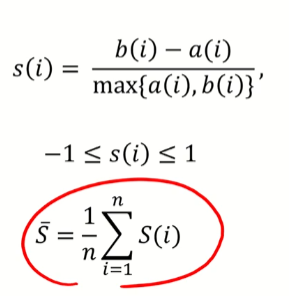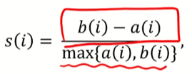 B(i)는 크면 클수록 좋다 -> i가 속해있지 않은 군집 간의 거리이기때문에
