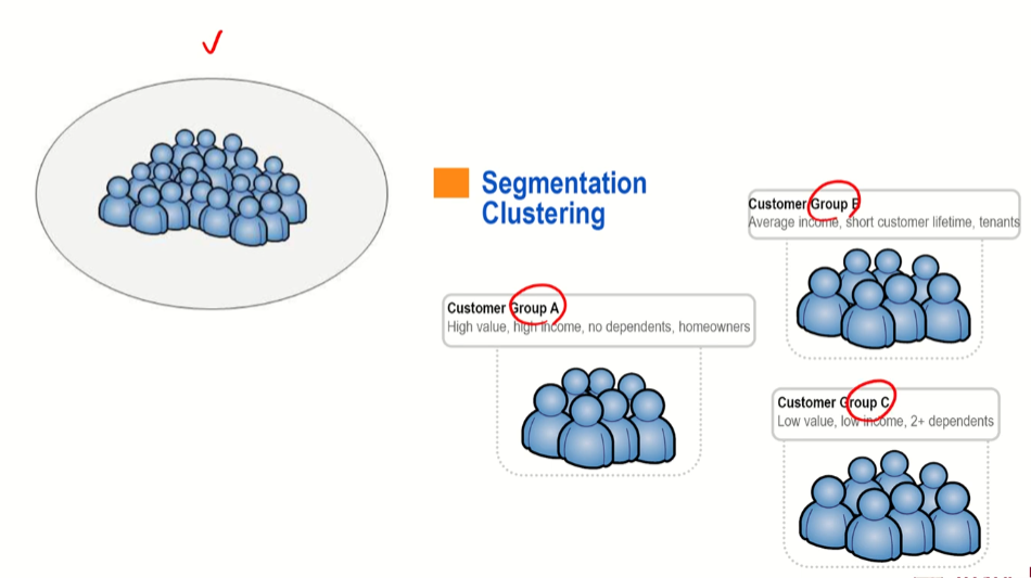 회사는 고객의 정보를 가지고 있음 -> 각각의 고객을 마케팅 하기에는 비효율 적 -> 비슷한 특징을 가진 고객끼리 모운다.