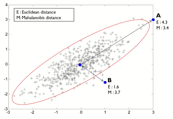 마할라노비스 거리로는 A가 중점에 더 가까운 것을 알 수 있다.