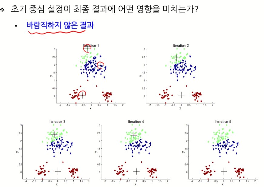 초기 중심은 종종 무작위로 설정됨: 군집화 결과가 초기 중심 설정에 따라 다르게 나타나는 경우가 발생할 수도 있음