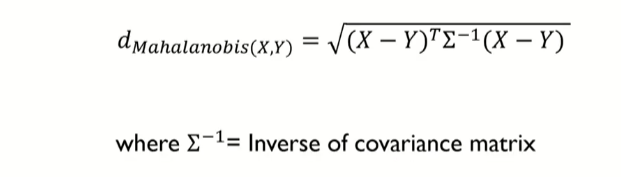 - 변수 내 분산, 변수 간 공분산을 모두 반영하여 X,Y 간 거리를 계산하는 방식