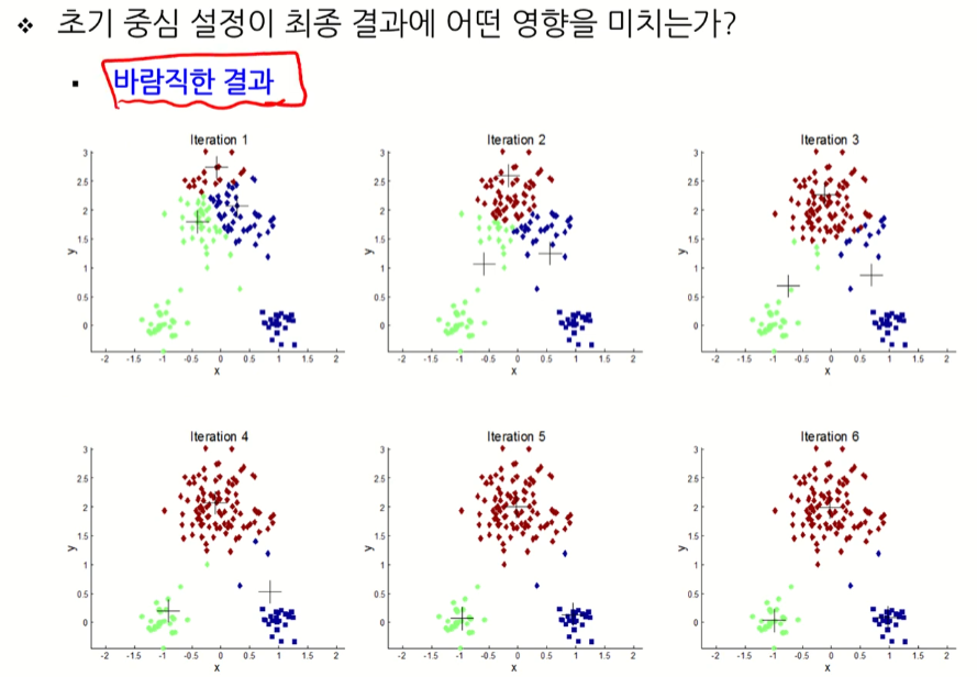 - 하지만 많은 경우 초기 중심 설정이 최종 결과에 큰 영향을 미치지는 않음