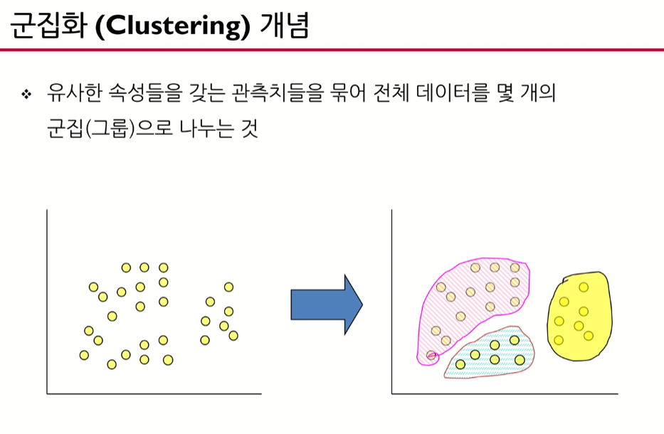 유사한 속성들을 갖는 관측치들을 묶어 전체 데이터를 몇개의 군집(그룹)으로 나누는 것