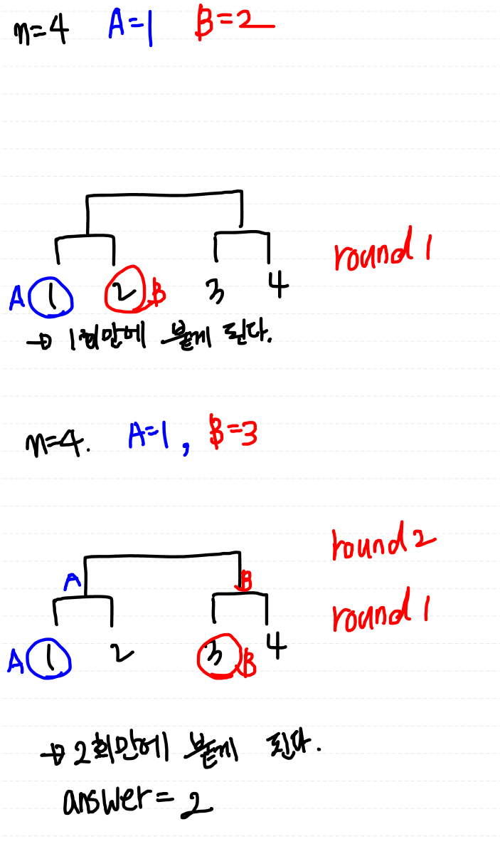 정리하자면 1라운드에서 a는 4번, b는 7번이다. 2라운드에서 a는 2번, b는 4번이다. 3라운드에서 a와 b 모두 1번이다. 이렇게 a와 b의 값이 같아졌을 때의 라운드(answer)가 결과 값이 된다.