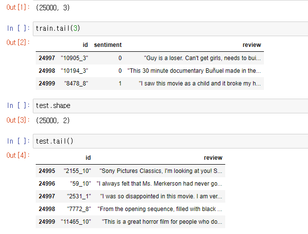 test = pd.read_csv('https://github.com/corazzon/KaggleStruggle/raw/master/word2vec-nlp-tutorial/data/testData.tsv', delimiter='\t', quoting=3)