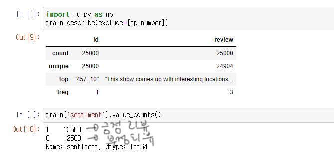 학습 데이터 셋에는 각각 긍정리뷰와 부정리뷰가 5:5 비율로 있다는 것을 알 수 있음
