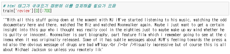 출력 값을 보면 해당 리뷰에 글자를 제외한 여러 기호나 태그들이 있는것을 알 수 있다. 우리는 이러한 데이터를 정제해주어야한다.