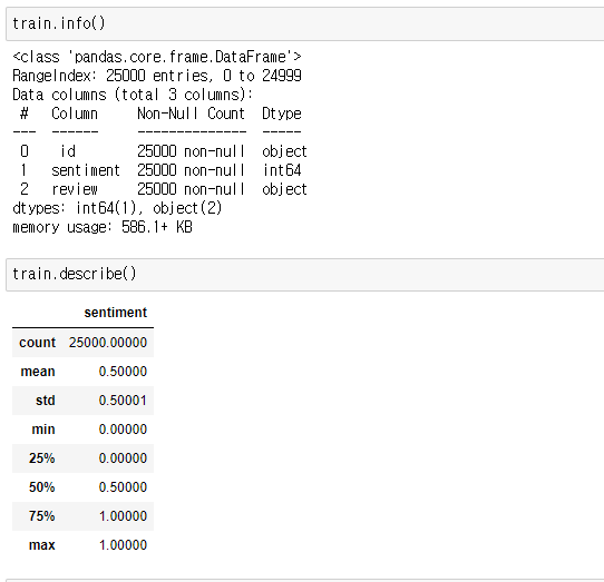 train = pd.read_csv('https://github.com/corazzon/KaggleStruggle/raw/master/word2vec-nlp-tutorial/data/labeledTrainData.tsv', delimiter='\t', quoting=3)