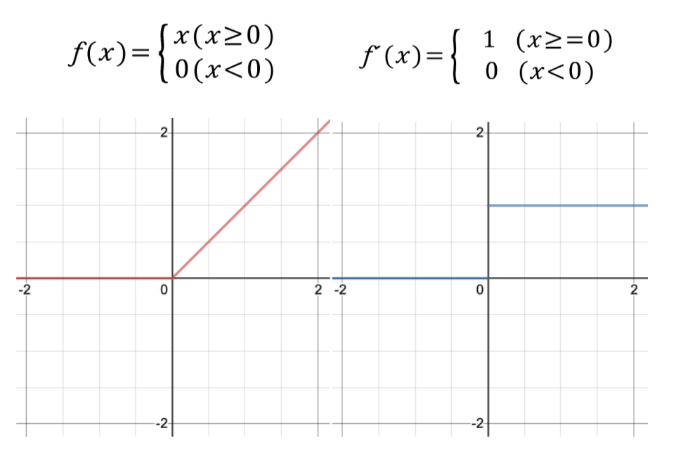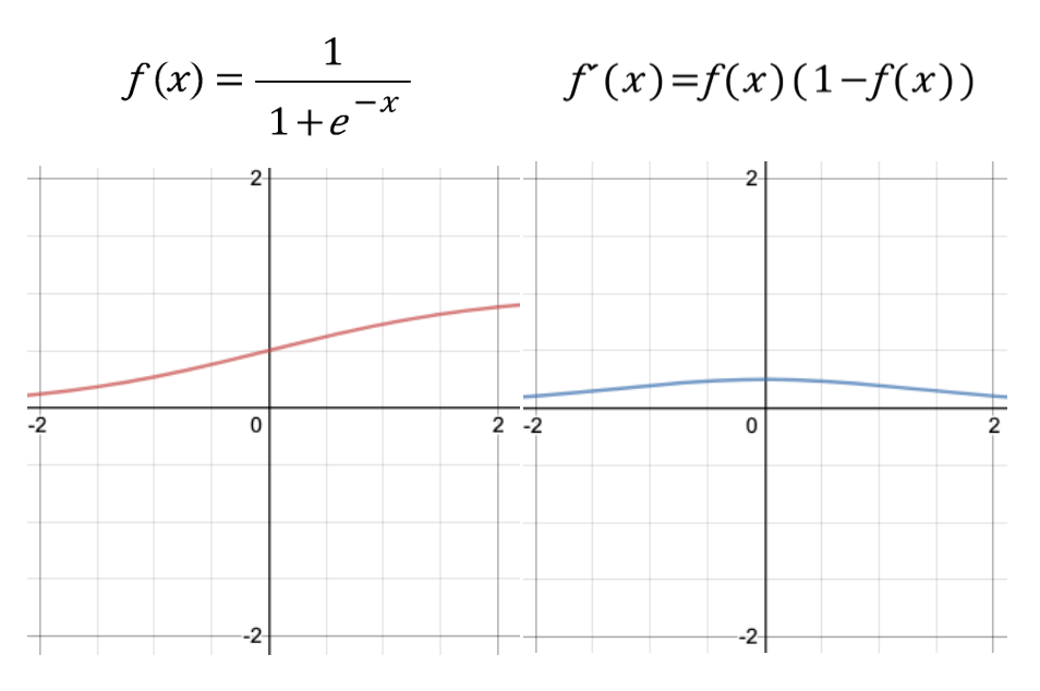 활성화 함수는 붉은 색 그래프, 활성화 함수의 미분값은 푸른색 그래프로 표현