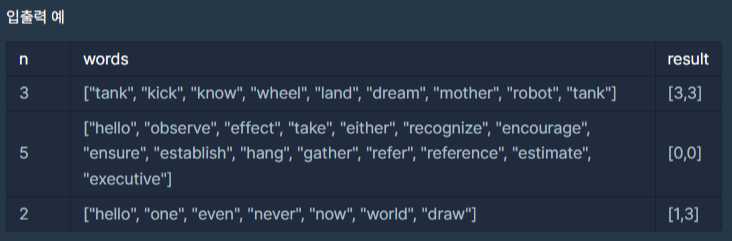 - 만약 주어진 단어들로 탈락자가 생기지 않는다면, [0, 0]을 return 해주세요.