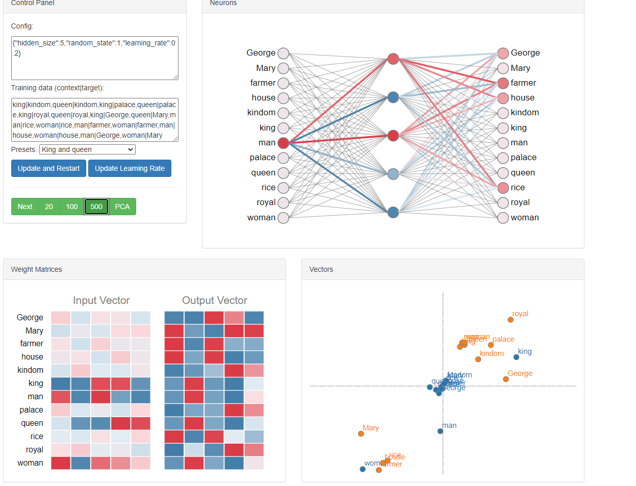 Training data (context|target): Presets: Update and Restart Update Learning Rate Next 20 100 500 PCA