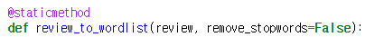 Word2Vec 의 경우 단어간의 문맥을 함께 고려하기때문에 불용어 처리(StopWord)는 False 해준다. (불용어도 함께 고려하여 모델 학습)