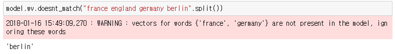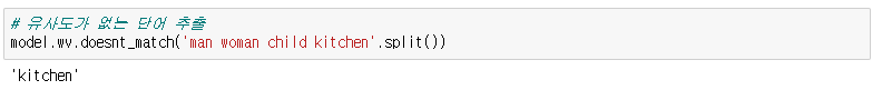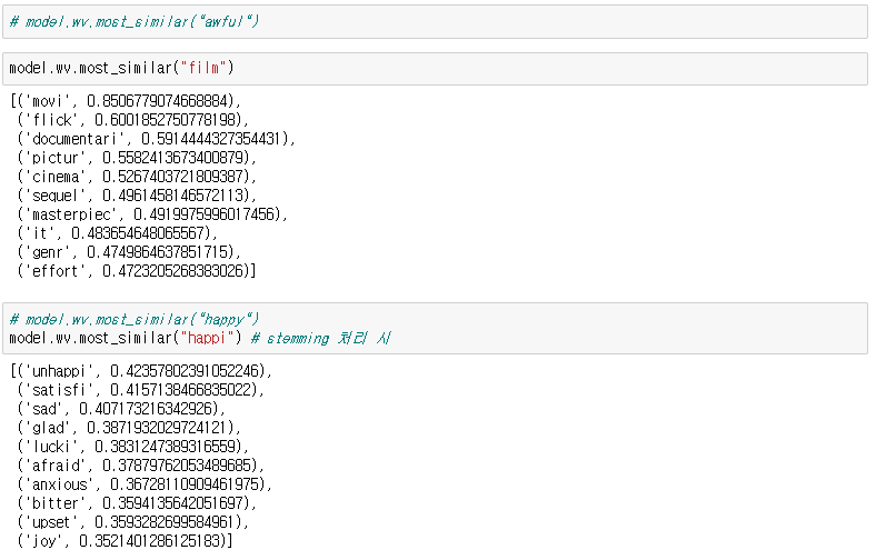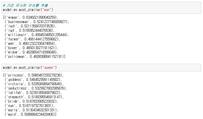 - 학습 알고리즘 : Hierarchical softmax (default) 또는 negative 샘플링. 여기에서는 기본값이 잘 동작한다.