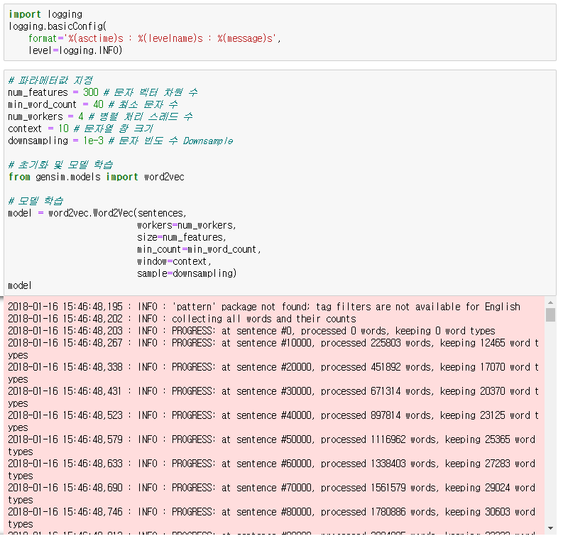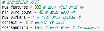 - 단어 벡터 차원 : 많은 feature를 사용한다고 항상 좋은 것은 아니지만 대체적으로 좀 더 나은 모델이 된다. 합리적인 값은 수십에서 수백 개가 될 수 있고 여기에서는 300으로 지정했다.