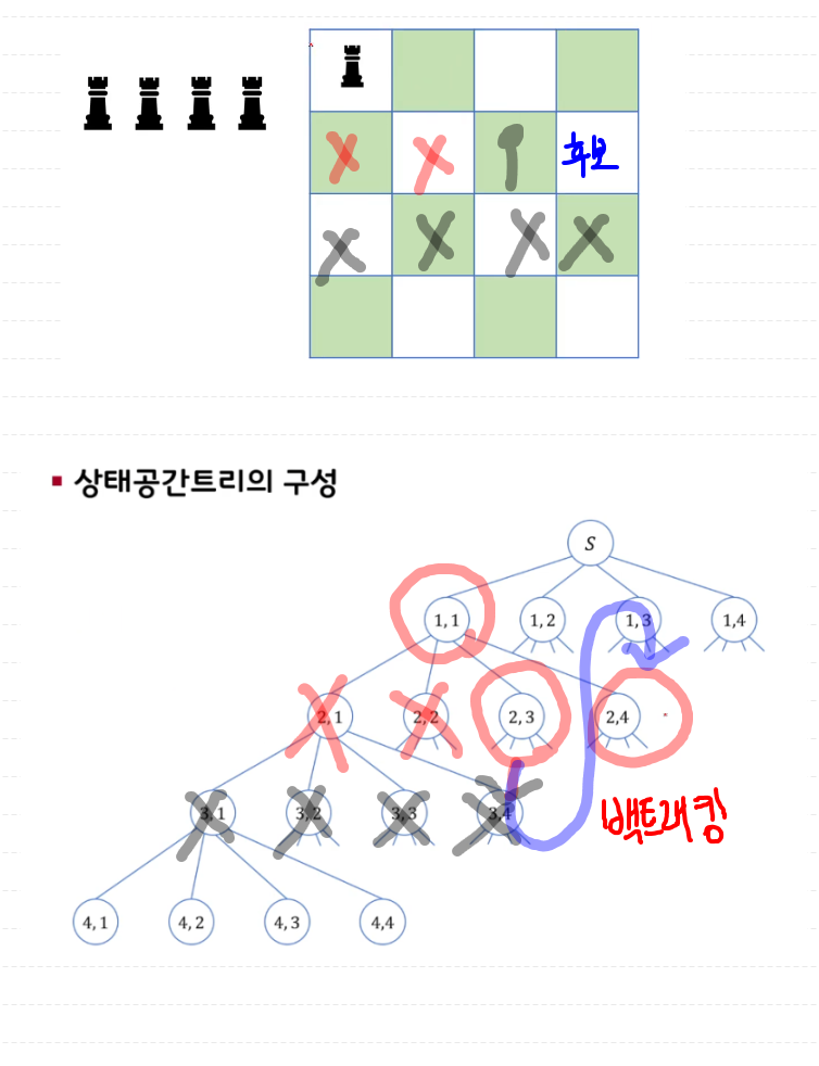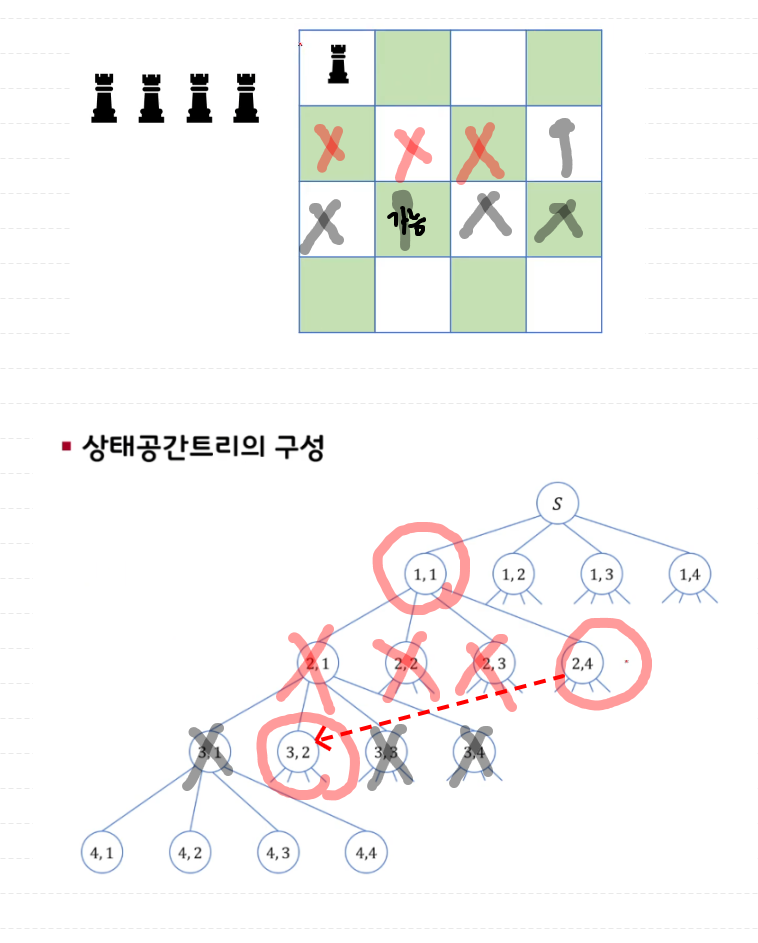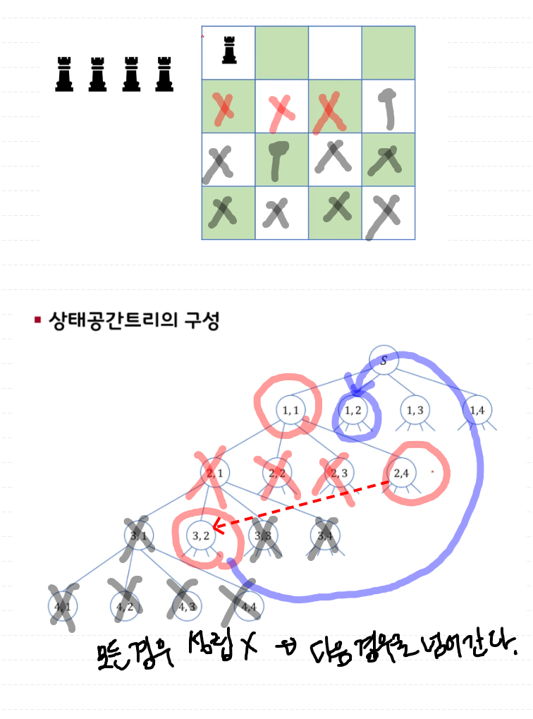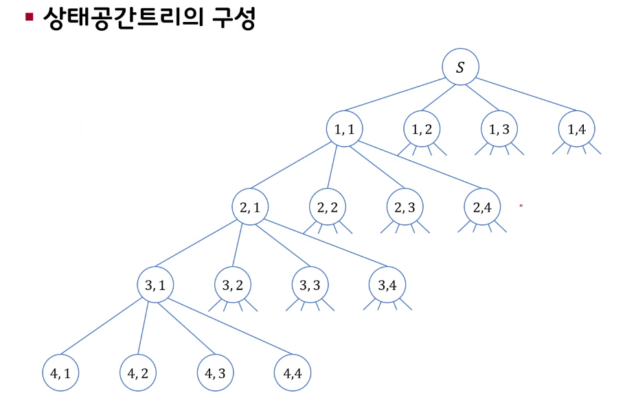 후보 해답: 4 * 4 * 4 * = 256 가지의 탐색 공간이 있음 (하나의 행에 하나만 놓을 수 있다는 것 -> 4가지, 4개의 행) -> 4*4*4*4