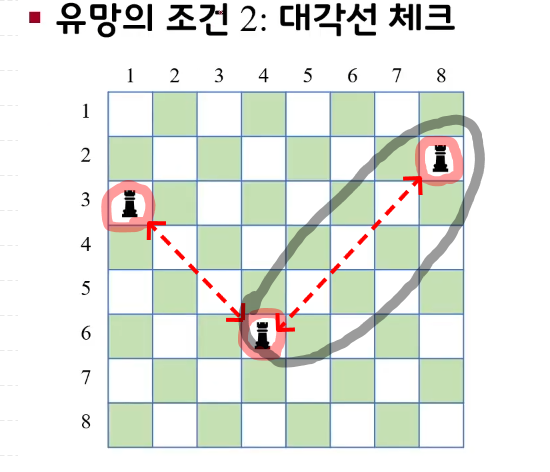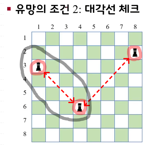 - 같은 열이나 같은 대각선에 놓이는지를 확인